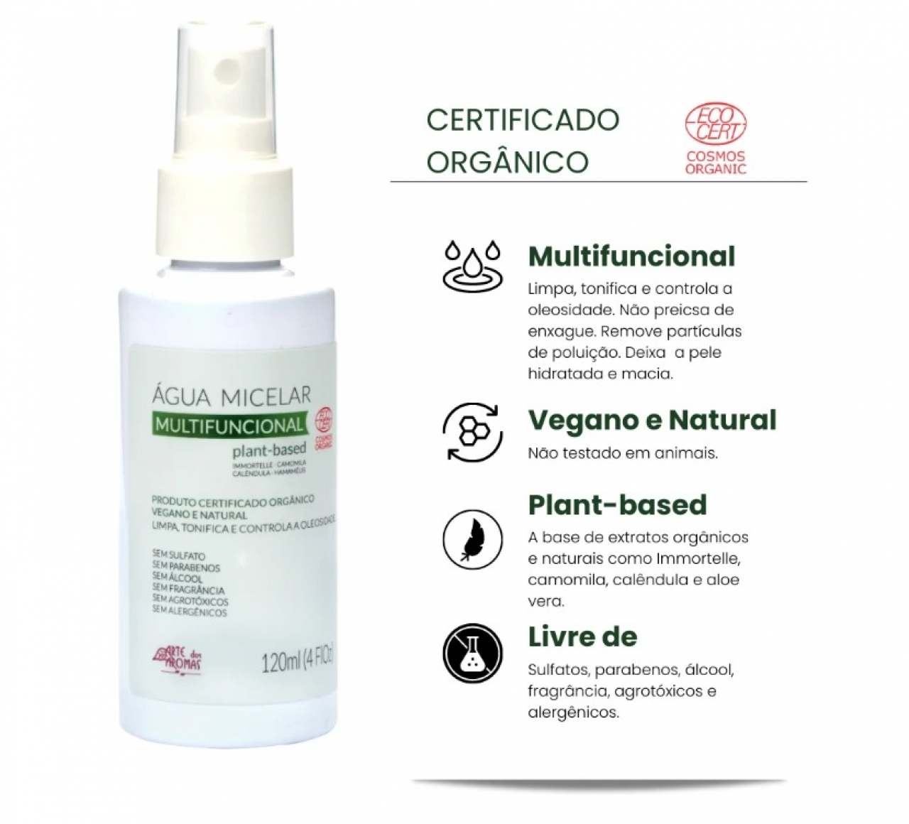 MULTIFUNCIONAL - Limpa, tonifica e controla a oleosidade. Remove a maquiagem e as impurezas da poluição, mantendo o equilíbrio e a hidratação da pele. Contêm extratos vegetais provenientes da agricultura orgânica. É indicada para higiene facial diária, podendo ser utilizada em todos os tipos de pele, inclusive as sensíveis, oleosas e acneicas.