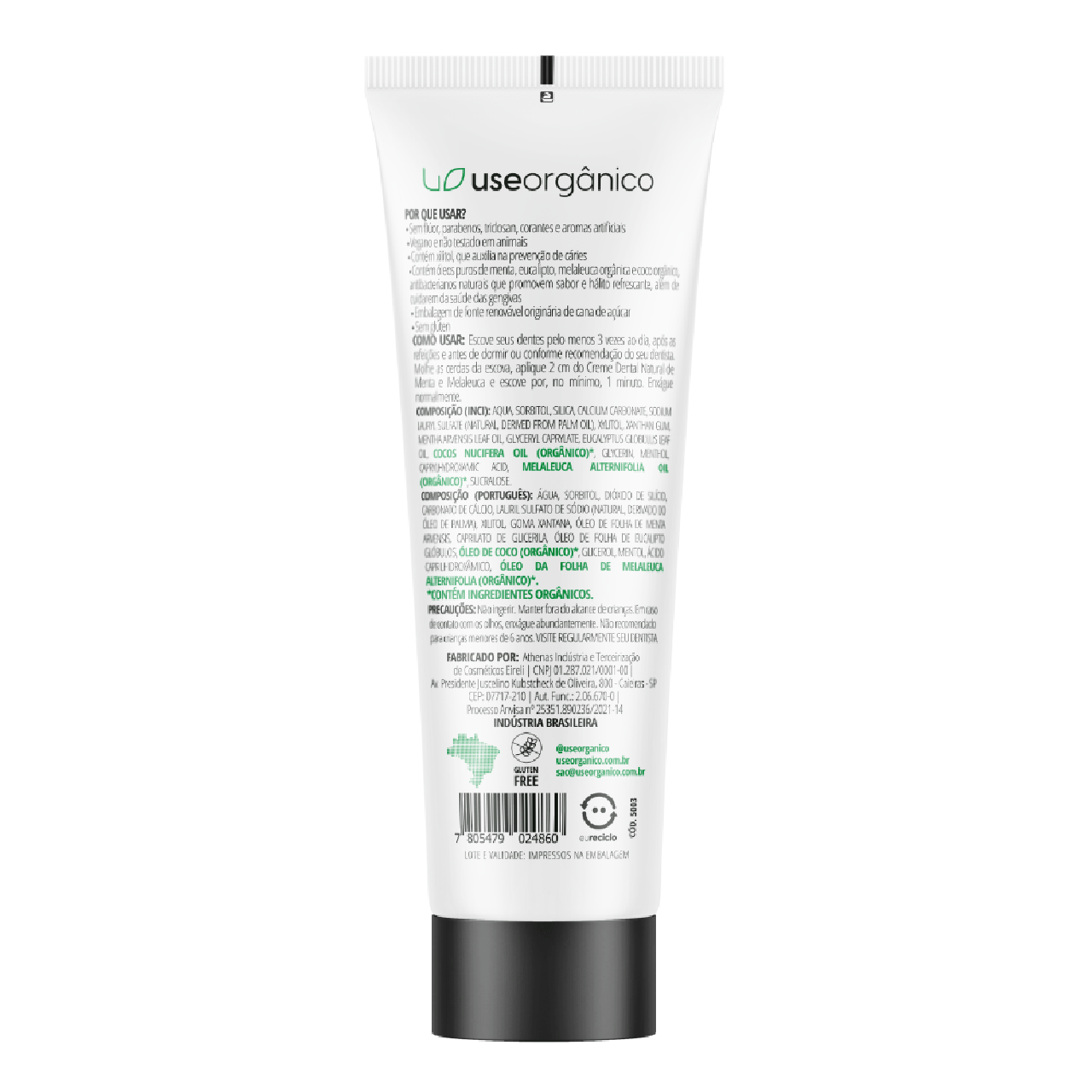 O Creme Dental Natural Vegano de Menta e Melaleuca da Use Orgânico cuida perfeitamente da sua saúde bucal, sem agredir sua gengiva e o esmalte dos seus dentes. É formulado com o óleo essencial de tea tree orgânico, que age contra bactérias e germes, além de ser antisséptico, cicatrizante e anti-inflamatório.