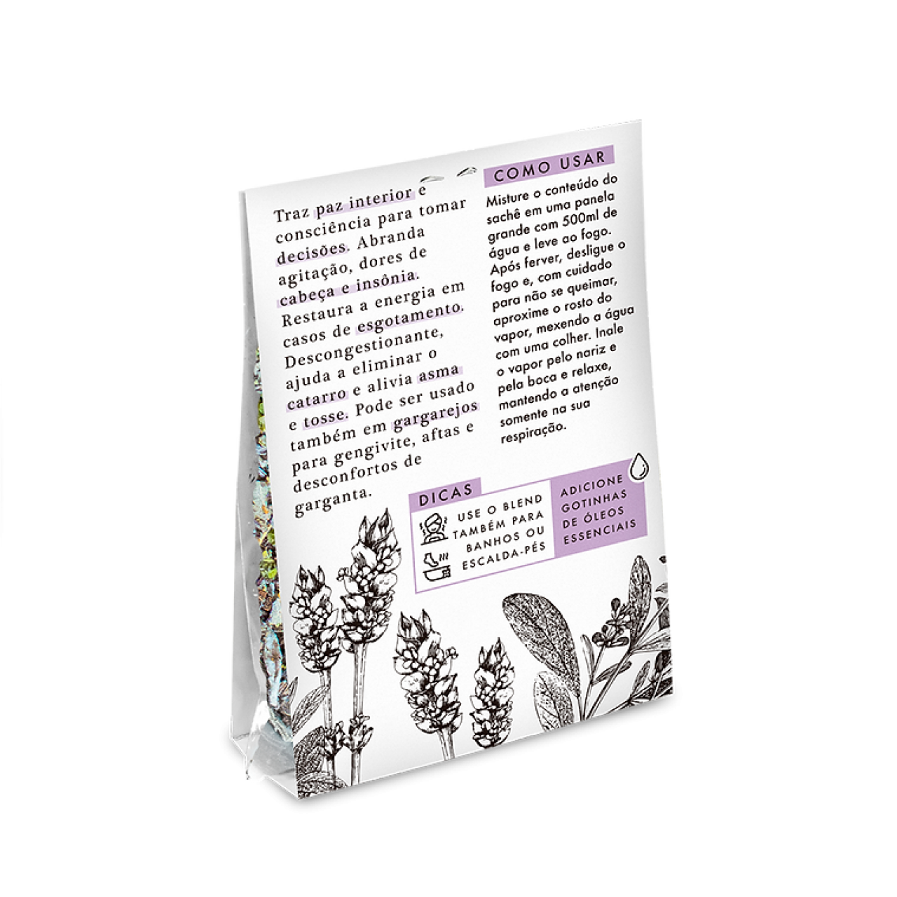 Misture o conteúdo do sachê em uma panela grande com 500ml de água e leve ao fogo. Após ferver, desligue o fogo e, com cuidado para não se queimar, aproxime o rosto do vapor, mexendo a água com uma colher. Inale o vapor pelo nariz e pela boca e relaxe, mantendo a atenção somente na sua respiração.