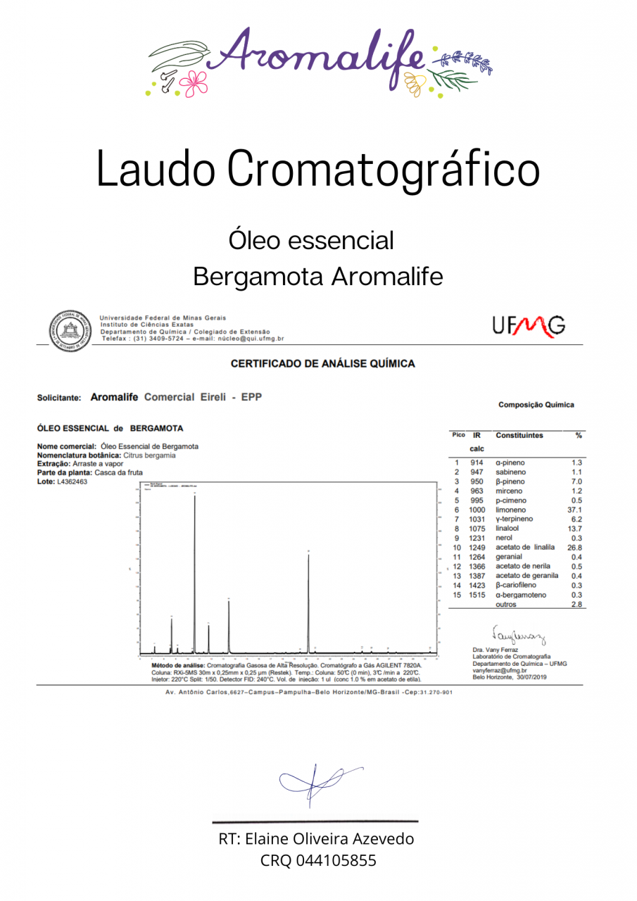 Composição: Citrus Aurantium Bergamia Peel Oil (d-Limonene, Linalool, Citral). Natural da própria planta.