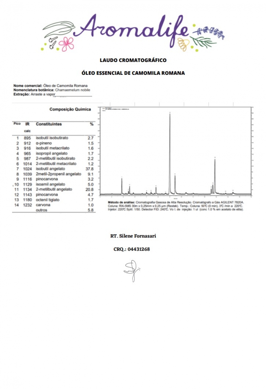Composição: Anthemis Nobilis Flower Oil (d-Limonene, Linalool). Natural da própria planta.