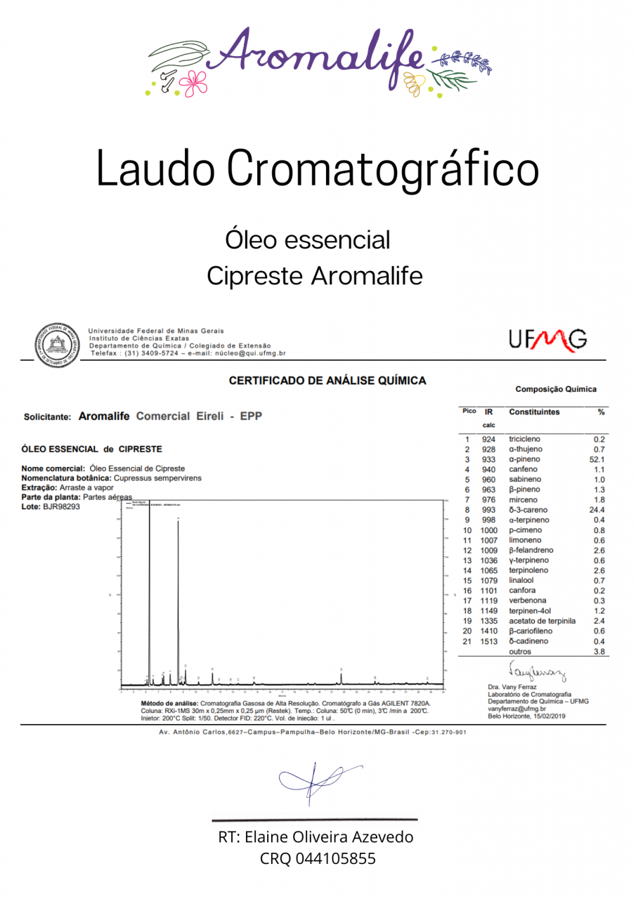 Composição: Cupressus Sempervirens Leaf Oil (d-Limonene, Linalool). Natural da própria planta.