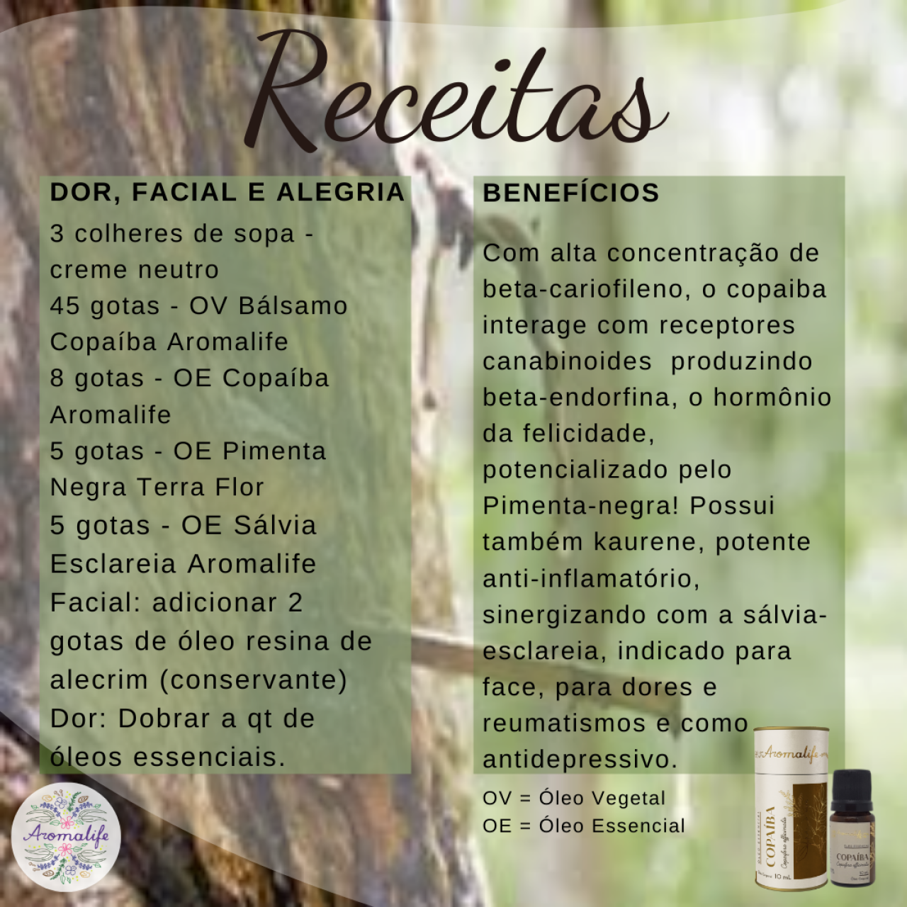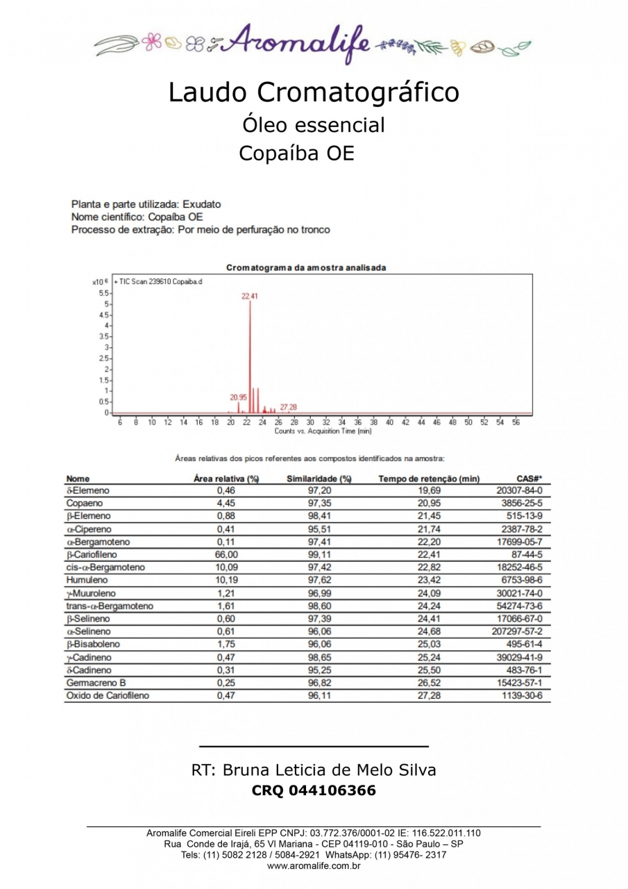 Composição: Copaifera Officinalis Resin Oil (Farnesol). Natural da própria planta.