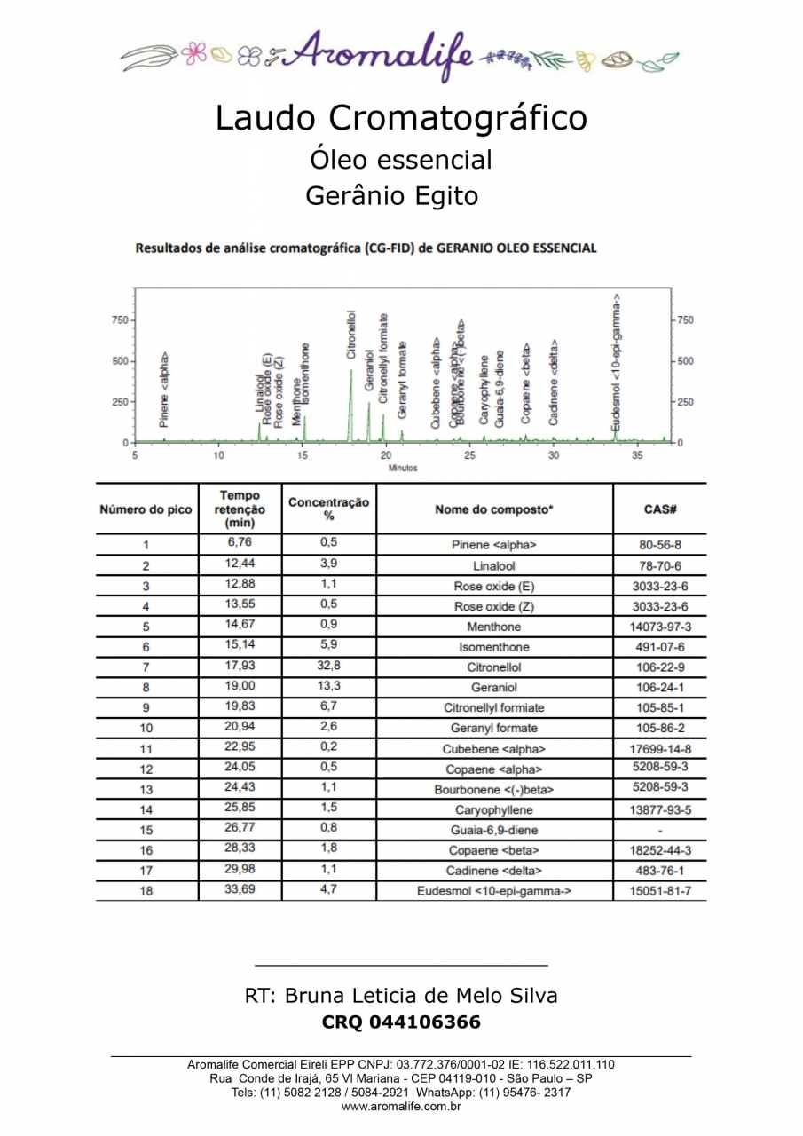 Composição: Pelargonium Graveolens Flower Oil (Citronellol, Geraniol, Linalool, Citral, d-Limonene). Natural da própria planta.