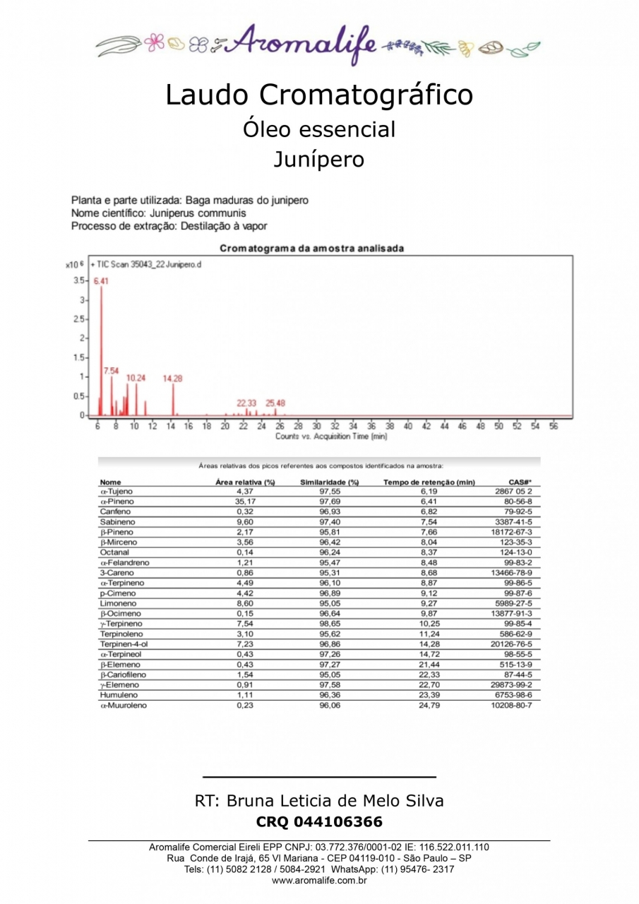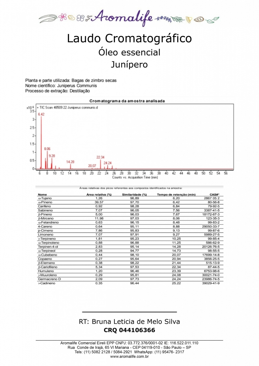 Composição: Juniperus Communis Wood Oil (d-Limonene). Natural da própria planta.