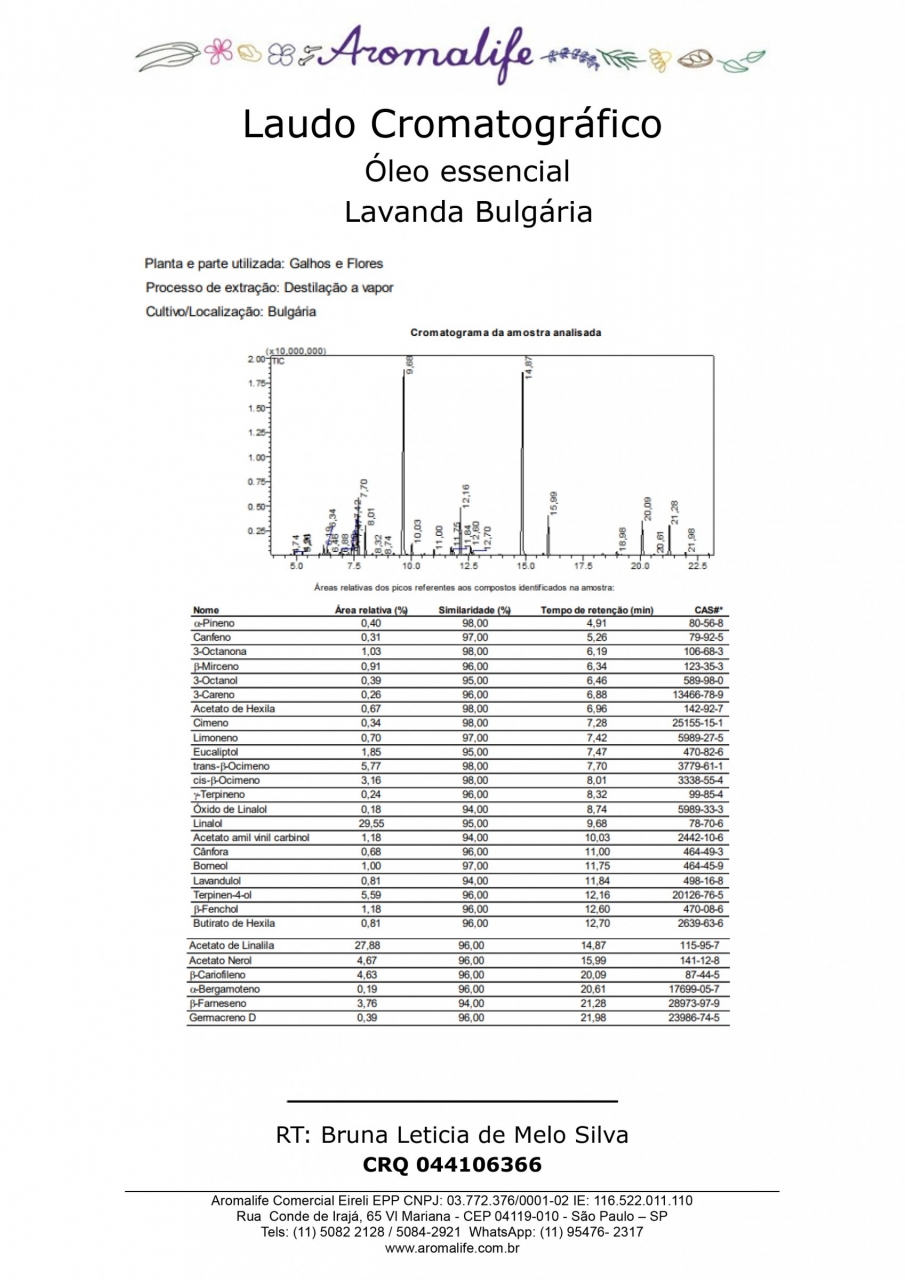 Composição: Lavandula Angustifolia Flower Oil (Linalool, d-Limonene). Natural da própria planta.