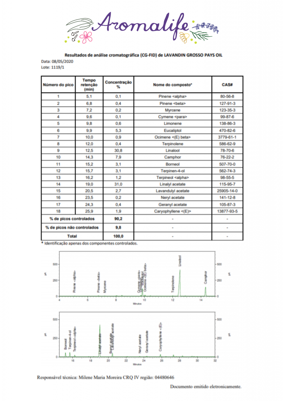 Composição: Lavandula Hibryda Oil (Linalool, d-Limonene, Coumarin, Citral, Geraniol). Natural da própria planta.