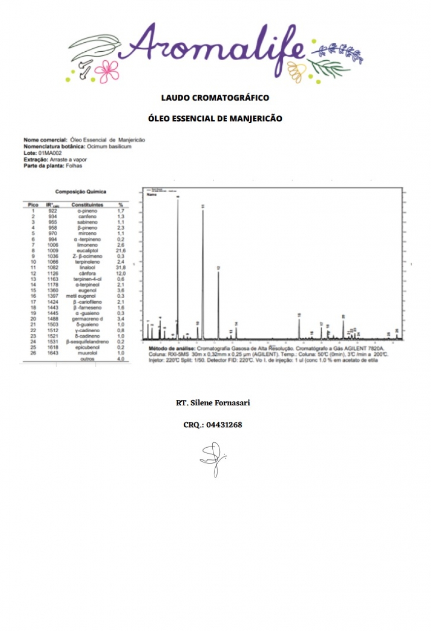 Composição: Ocimum Basilicum Oil (Linalool, Eugenol, d-Limonene). Natural da própria planta.