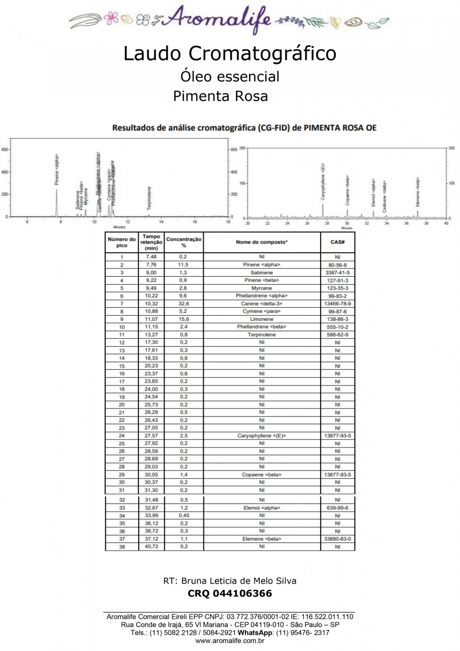 Composição: Schinus Terebinthifolius Seed Oil (d-Limonene). Natural da própria planta.